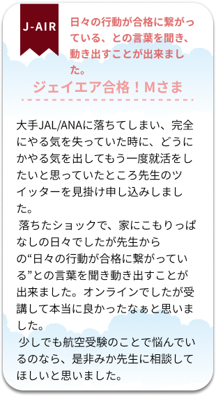 新卒では全滅敗退であったエアライン受験から既卒で内定した経験を活かしてエアライン専門の就職活動サポートを開始。