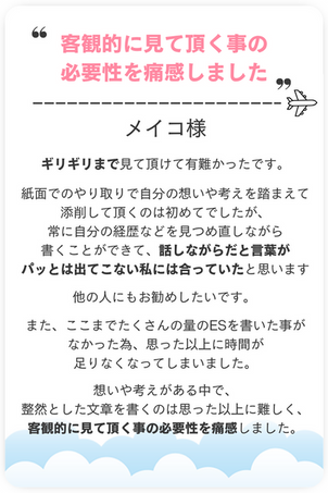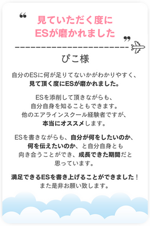 - 自己分析と企業研究を含めたES添削をご希望の方は「ESフルサポート講座」をご検討ください。