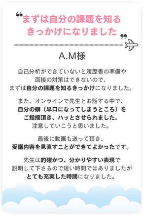 だからこそ、あなたの過去や今の状況から面接官に聞かれるであろうトピックに対して自信を持って回答できるように一緒に納得するまで整えます