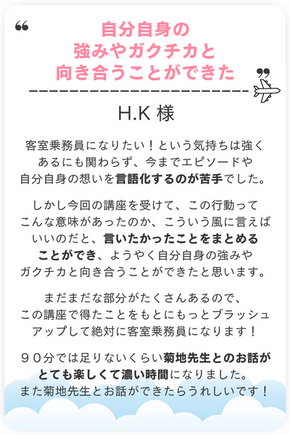 この講座では、自己分析をしながらご自身のこれまでの経験をお話ししていただきながら、客室乗務員やグランドスタッフと言った職種への適性に繋げていくことはもちろん、面接官に適性を感じてもらうために【どう表現していくか?】を大事にします